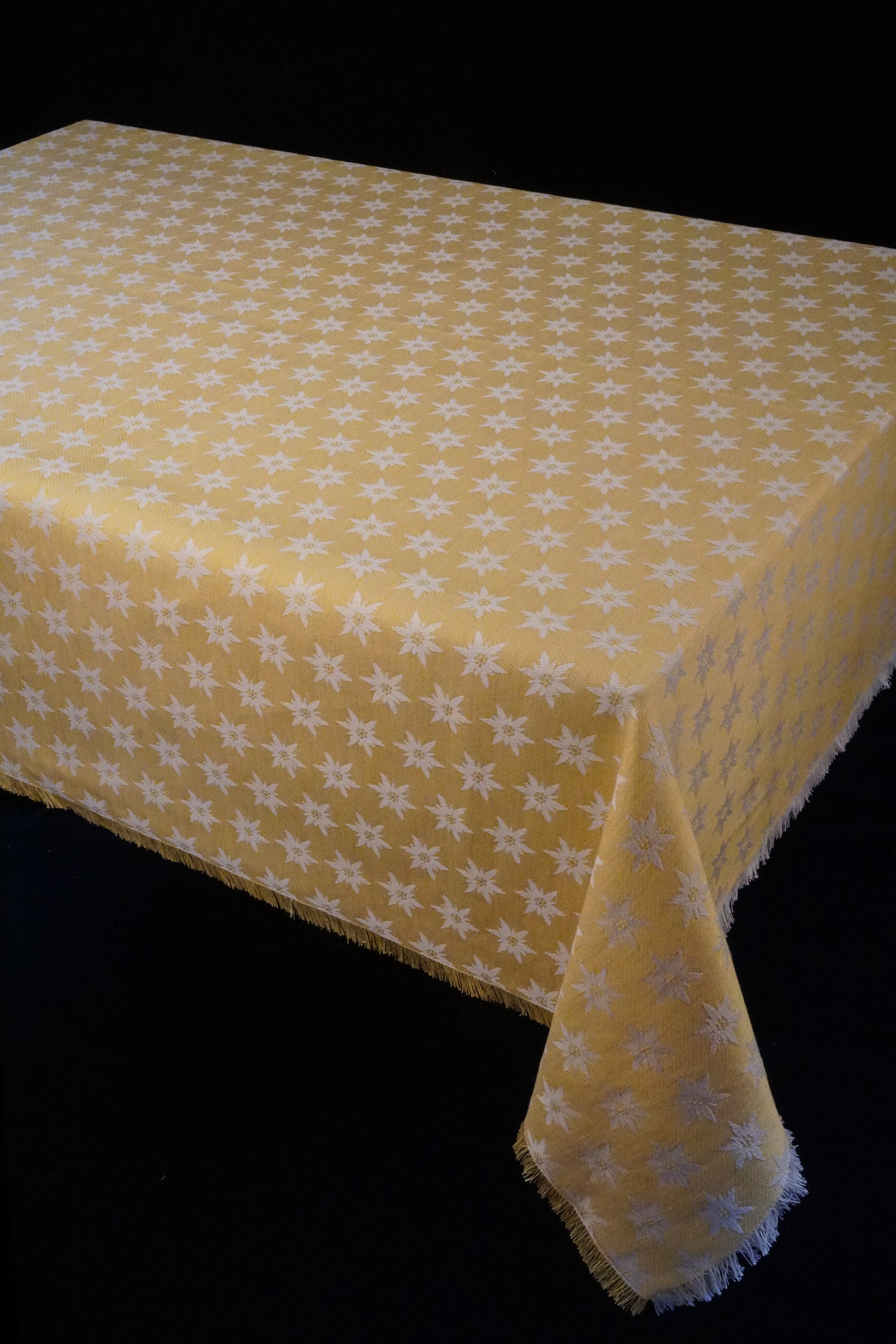 The tablecloths are made in the standard sizes of 6, 8, and 12 people in rectangular, square, round and oval shapes. Normally we calculate 30 cm of fall per part considering that at the first washing the tablecloth narrows by approx. 5-8%. Obviously having the production at home you can order any type of fabric/tablecloth in any size required up to the maximum width of 300 cm, in length there are no limits. There are different finishes: the classic fringe, or 4 cm hem, 4 cm hemstitch, and on order by email, the different trimmings and laces that you can choose.